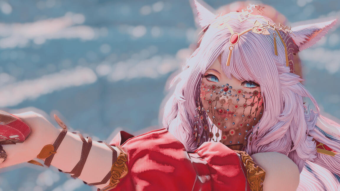 | Under the night sky when Ul'dah comes alive there in the Ruby Road Exchange is a small troupe of Miqo'te adorned in eye-catching outfits. The one with long pink curls and rose colored finery piques your interest. |