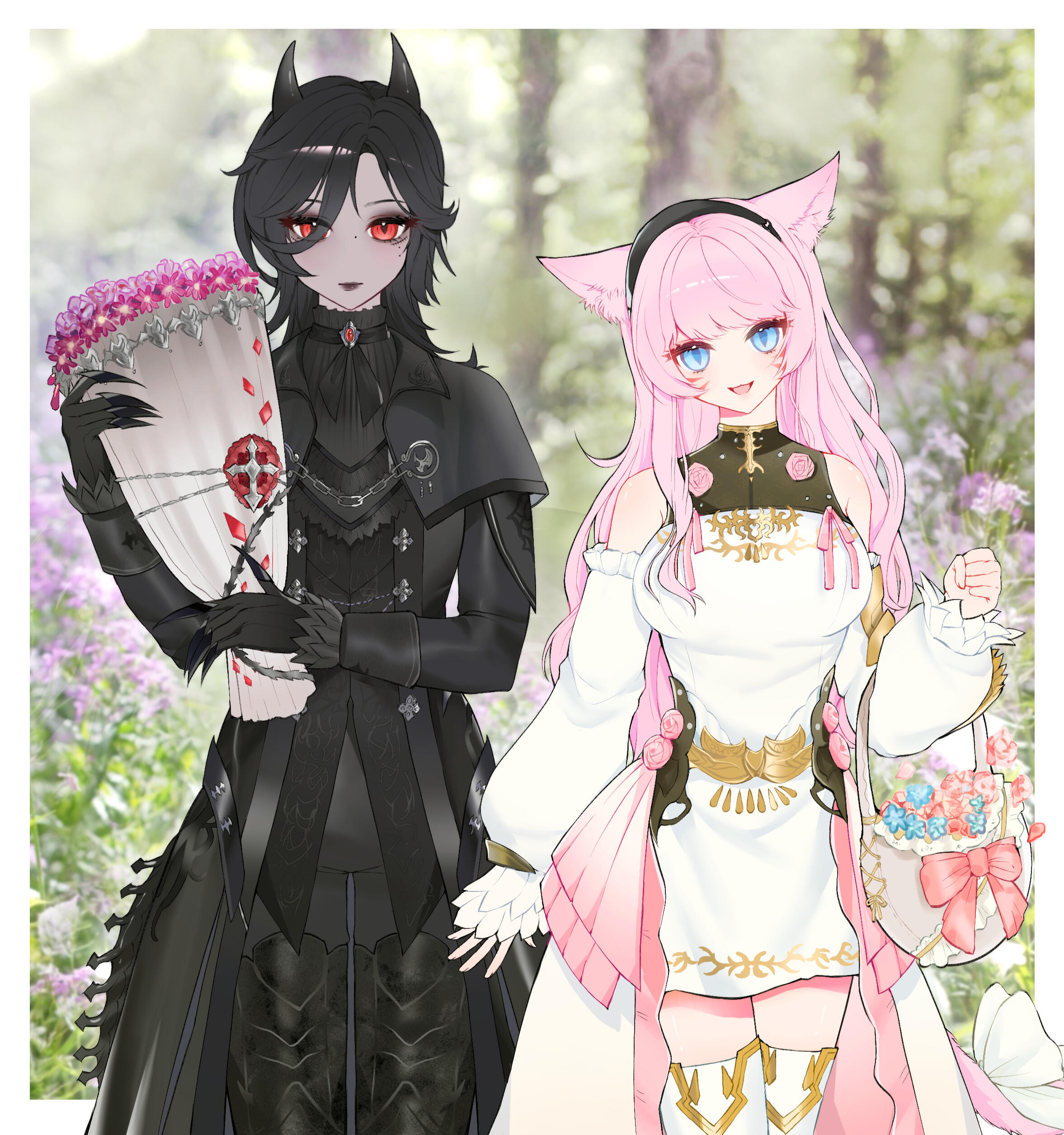 | Under the night sky when Ul'dah comes alive there in the Ruby Road Exchange is a small troupe of Miqo'te adorned in eye-catching outfits. The one with long pink curls and rose colored finery piques your interest. |